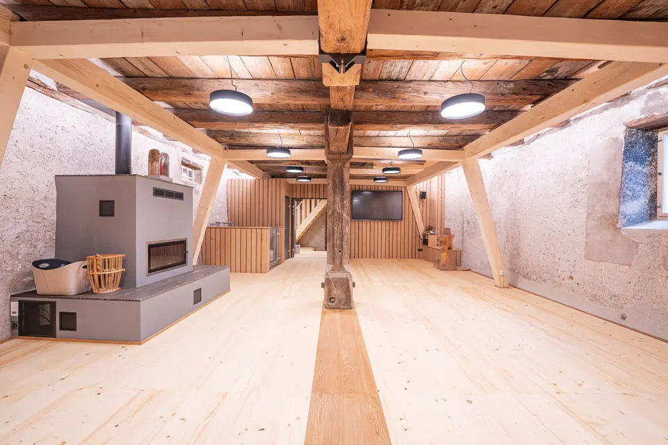 Sanierung Dachstock, Unterdach mit neuer Eindeckung ergänzt (alte und teils neue Ziegel), neue statische Lastabfangungen, Einbau Nasszellen, Küchen, Innentreppe, Warenlift und Warmluftcheminée